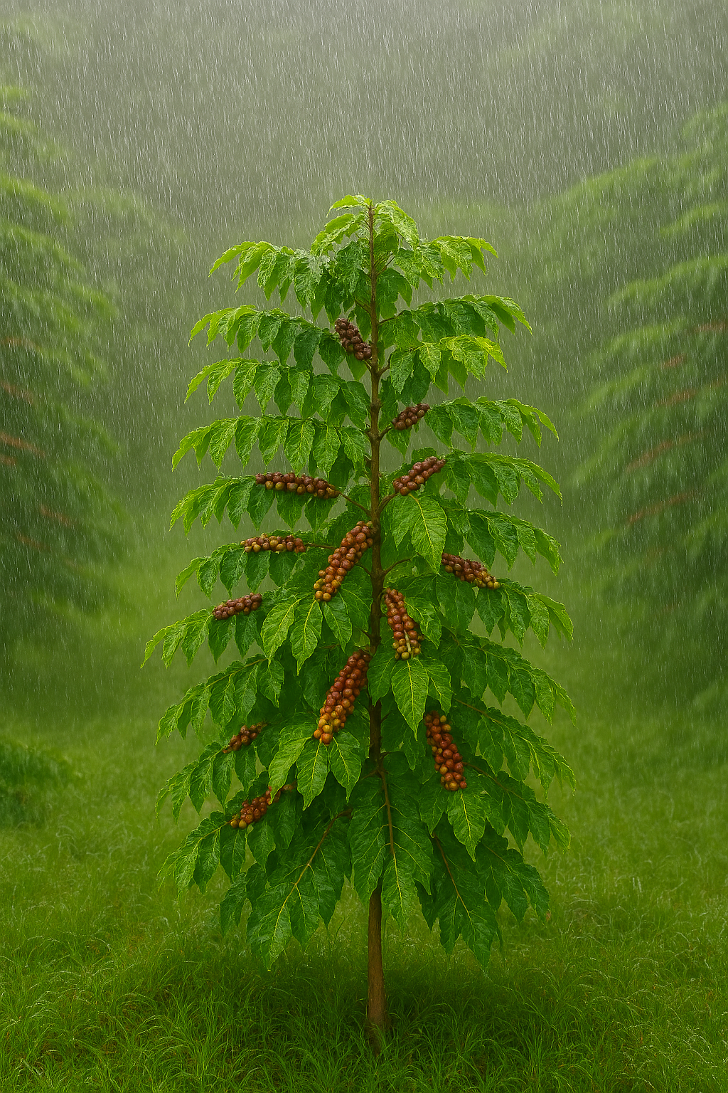 雨の中で実をつけるコーヒーの木(コーヒー栽培のイメージ)