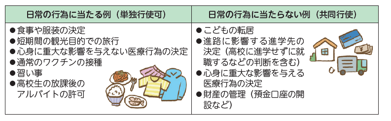 もっとも、これはすべての場面で必ず両親の同意が必要という意味ではありません。日々の生活の中で、食事や通院、送り迎えなど細かな判断をすべてその都度話し合って決めるのは、現実的ではないからです。