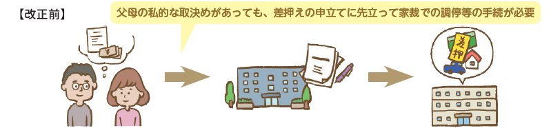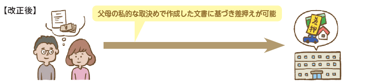 従来は、支払がなかった場合に差押えを行うためには、公正証書や調停調書などが必要となる場面が多くありました。しかし改正後は、父母間で作成した文書に基づいて差押えを申し立てることができる仕組みが整えられています。